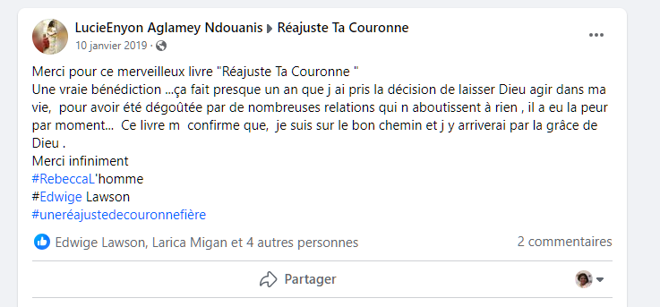 Je suis la femme derrière les livres “Réajuste ta couronne” et “Du Deuil à la Guérison”. J’écris pour édifier, parce que je crois sincèrement que Dieu peut utiliser nos expériences pour aider d’autres personnes qui traversent les mêmes difficultés.